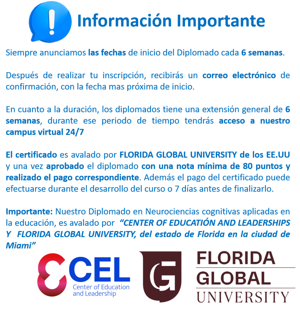 •Certificado internacional que se otorga: Diplomado en Neurociencias Cognitivas aplicado en la educación. Por: